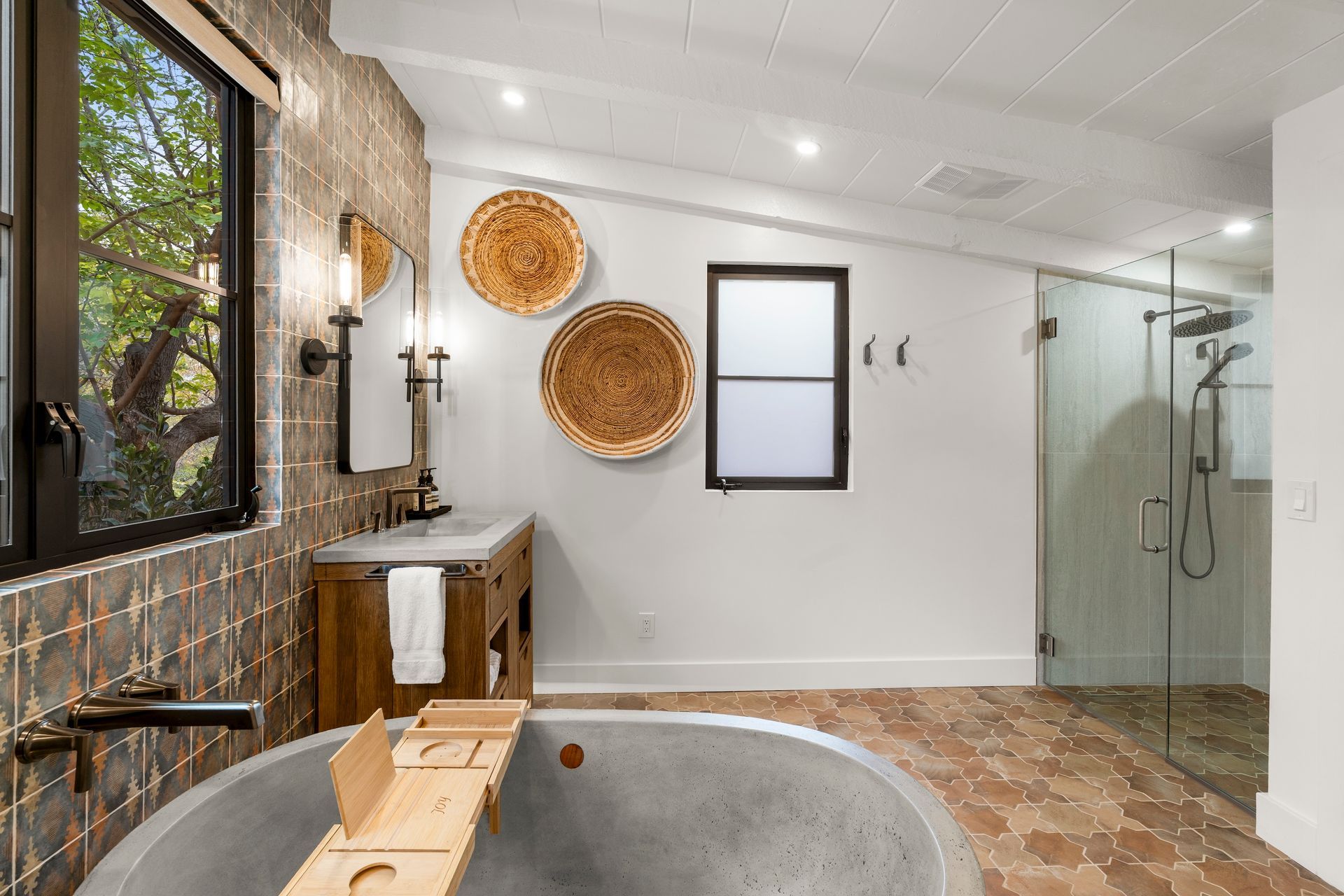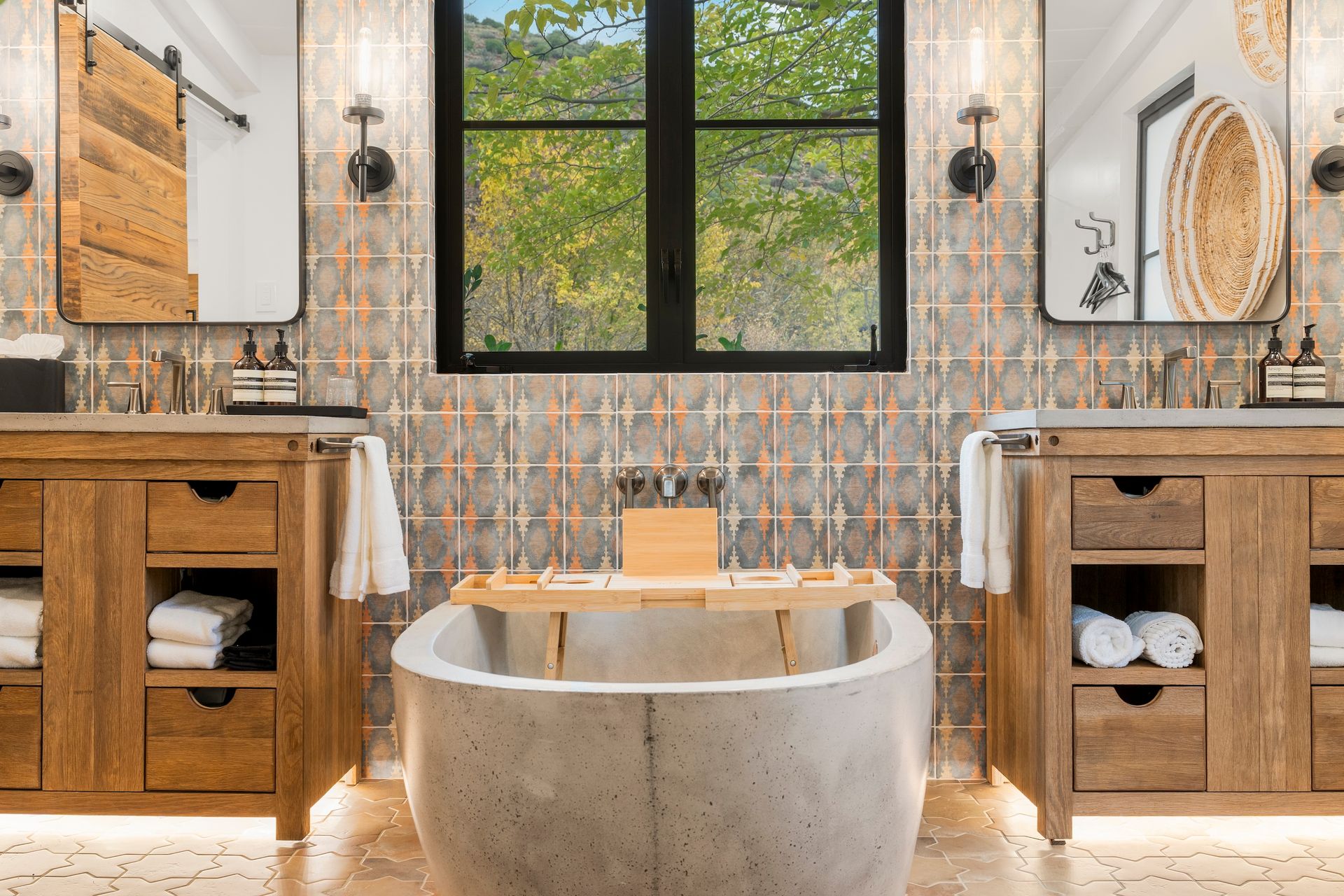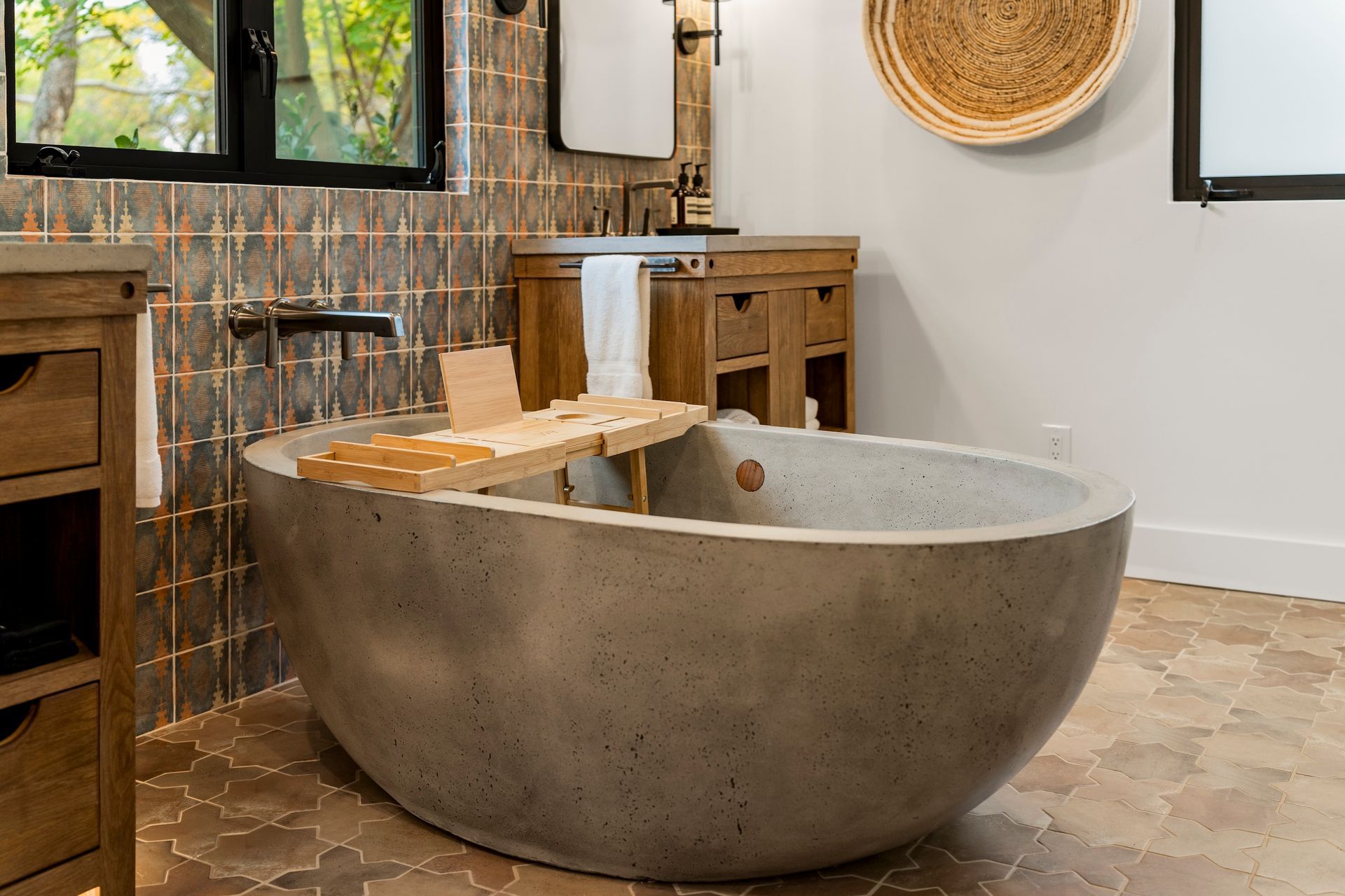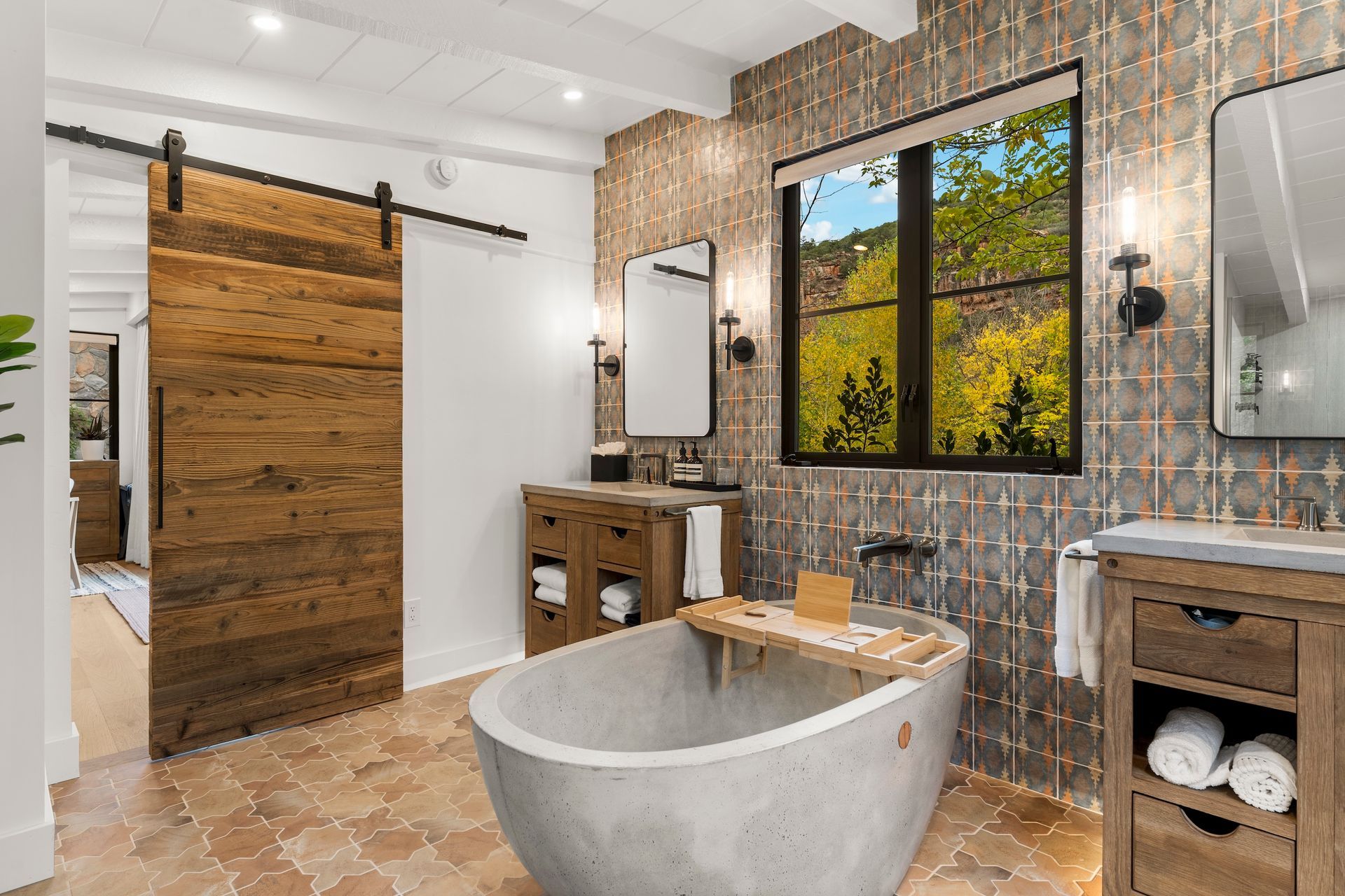 property with the sounds of Oak Creek bubbling only footsteps away. This fabulous cabin holds a twelve hundred pound, luxurious concrete soaking tub.