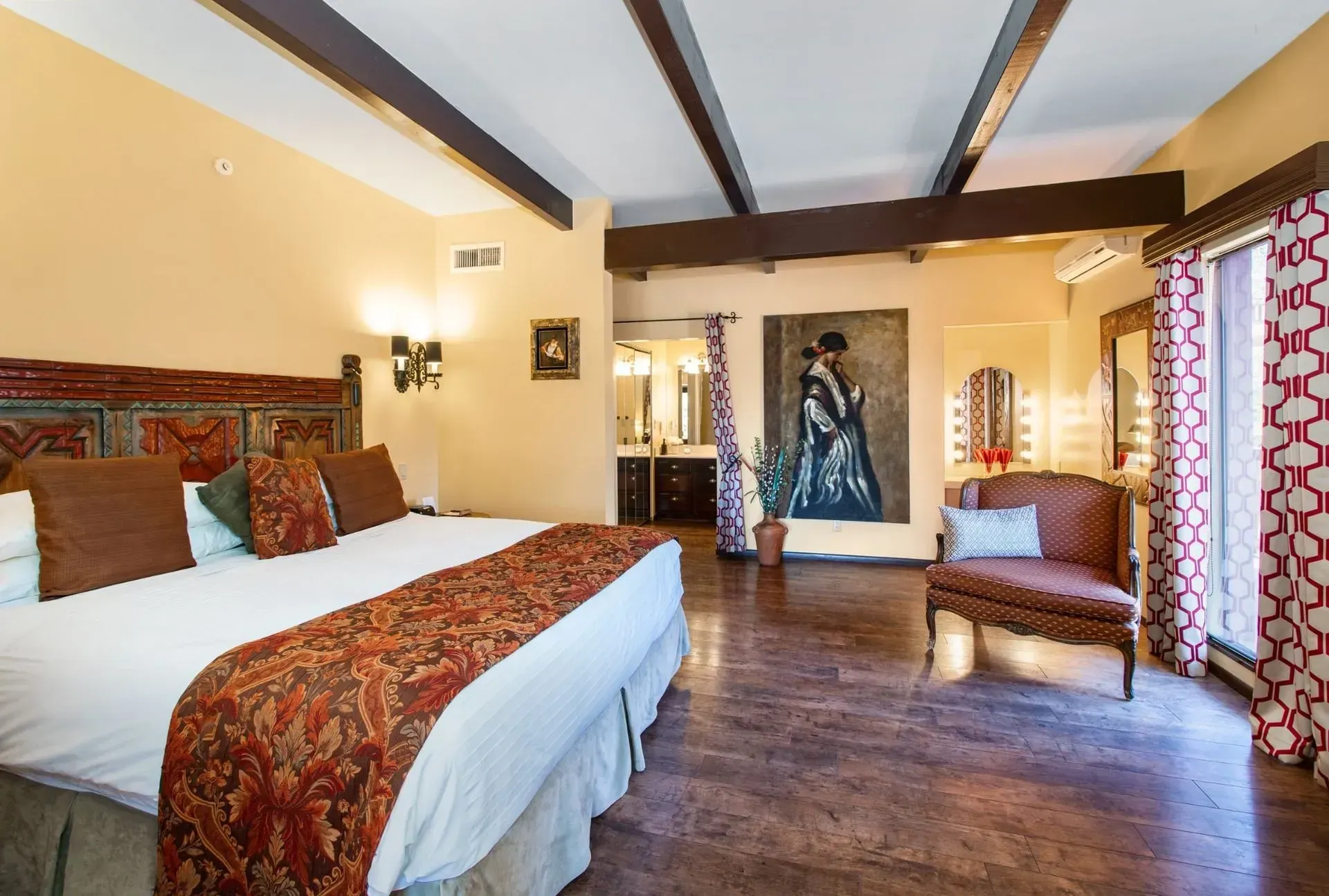 This beautiful Spanish inspired colonial suite is large, cozy, and comfortable. The floors are rich and warm, the walls glow with light, and the windows offer a panorama of red rock views. The large king bed is set with crisp white linen wrapped around over-sized fluffy down pillows.